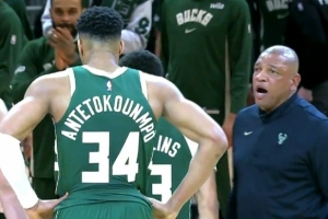 GIF-雄鹿落后20分 里弗斯和字母哥溝通 后者直接忽視