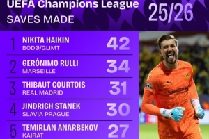 體育資訊1月23日訊 數(shù)據(jù)機(jī)構(gòu)Squawka統(tǒng)計(jì)本賽季歐冠門(mén)將撲救次數(shù),博德閃耀門(mén)將尼基塔·哈伊金以42次居首。