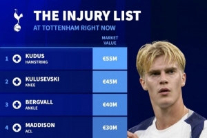 體育資訊1月23日訊 德國轉會市場列出了熱刺傷員的身價排名,庫杜斯5500萬歐居首,庫盧塞夫斯基4500萬歐次席。