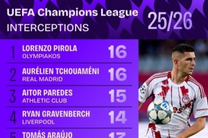 體育資訊1月23日訊 Squawka統(tǒng)計(jì)了球員本賽季歐冠的攔截次數(shù),并列出榜單,瓊阿梅尼、皮羅拉16次居首。