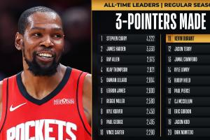 本場比賽上半場,杜蘭特命中兩記三分,生涯三分數(shù)來到2283個,超越賈森·特里,升至NBA歷史第11,排在第10的是文斯·卡特(2290個)。