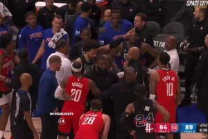 GIF-活塞和火箭沖突 坎寧安拉開霍蘭后指著火箭球員說道:你們都給我退后!我可要揍你們了,別再惹我們了,笨蛋!
