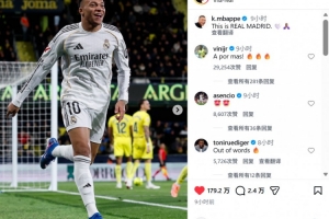 本場比賽姆巴佩梅開二度,其中包括一粒勺子點球。賽后姆巴佩也在社媒曬出本場慶祝進(jìn)球照片,配文寫道:“這就是皇馬!”