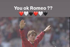 雖然貝克漢姆是曼聯(lián)名宿,但他的二兒子羅密歐則是阿森納球迷。賽后,貝克漢姆曬出自己曼聯(lián)球員時期的慶祝照@羅密歐:“你還好嗎??”