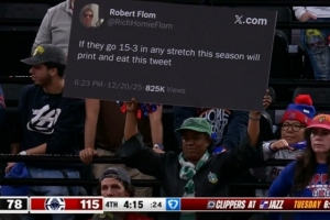 而在此前,一位網(wǎng)友曾表示,如果快船本賽季能夠在任意階段取得15勝3負(fù),他將打印這條推文并吃掉。