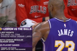 詹姆斯生涯對(duì)陣公牛1837分僅次于賈巴爾1895分