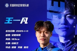 王一凡租借加盟無錫吳鉤足球俱樂部,租借期至2026年12月31日。希望王一凡在租借期間刻苦訓(xùn)練,通過更多的比賽累積經(jīng)驗(yàn)。