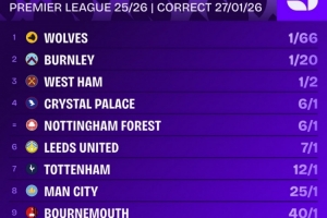 本賽季英超降級(jí)賠率排名:
