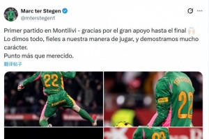 特爾施特根社媒曬出比賽照片,并寫道:“我在蒙蒂利維的首場比賽,感謝大家一直到最后的全力支持?!?/p>