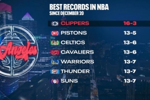 快船戰(zhàn)勝爵士,轉(zhuǎn)播方曬出12月20日(當(dāng)?shù)貢r(shí)間)以來(lái)聯(lián)盟戰(zhàn)績(jī)前七的球隊(duì),快船高居第一: