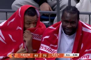 終場前3分58秒,北京以72-82落后,當轉播方鏡頭給到場邊北京兩名外援時,斯佩爾曼和馬帝昂的臉上都洋溢著笑容,前者還邊說話邊捂嘴笑。