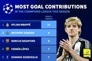 體育資訊1月29日訊 歐冠聯(lián)賽階段最后一輪比賽即將開(kāi)賽,德國(guó)轉(zhuǎn)會(huì)市場(chǎng)盤(pán)點(diǎn)了參加歐冠球員參與進(jìn)球數(shù),姆巴佩11球居首,戈登、拉什福德8球位居次席。