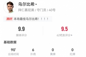體育資訊1月29日訊 拜仁在本輪歐冠2-1力克埃因霍溫,小將烏爾比希本場(chǎng)數(shù)據(jù)如下: