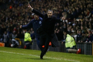 場(chǎng)邊的穆里尼奧飛奔慶祝!一如22年前的歐冠邊線的狂奔,而如今穆帥早已白了頭。