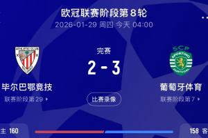 體育資訊01月29日訊 歐冠聯(lián)賽階段末輪,葡萄牙體育客場(chǎng)3-2逆轉(zhuǎn)戰(zhàn)勝畢爾巴鄂,最終排名第七直通歐冠16強(qiáng)。