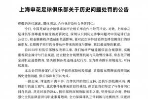 上海申花官方發(fā)布《關(guān)于歷史問(wèn)題處罰的公告》,表示尊重并接受該處罰決定,向球迷和合作伙伴致以最誠(chéng)摯的歉意。