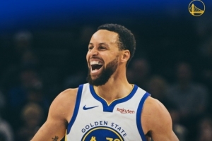 賽后勇士發(fā)布贏球海報,封面為庫里大笑瞬間。
