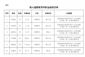 根據(jù)中國乒乓球協(xié)會關(guān)于舉辦2026年國家青年隊入隊選拔賽(U15組)的通知及《2026年國家青年隊入隊選拔賽(U15組)競賽規(guī)程》要求,21名運動員擬入選國家青年隊?,F(xiàn)對運動員名單進行公示,公示期為2026年1月29日至2026年2月3日(名單附后)。