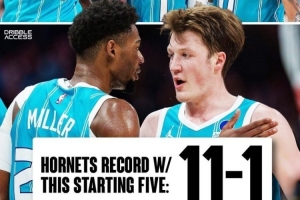 據(jù)統(tǒng)計,黃蜂使用拉梅洛·鮑爾、布蘭登·米勒、克尼佩爾、布里奇斯、迪亞巴特這套首發(fā)的戰(zhàn)績?yōu)轶@人的11勝1負(fù)。