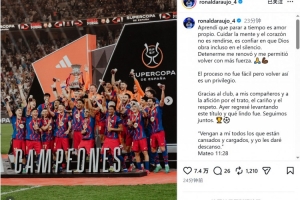 體育資訊1月13日訊 巴薩后衛(wèi)阿勞霍更新社媒動(dòng)態(tài),談到了復(fù)出并隨隊(duì)贏得西超杯的感受。