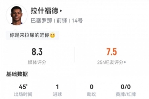 體育資訊2月1日訊 本輪西甲,巴薩3-1客勝埃爾切。此役拉什福德替補出場45分鐘,球員全場重點數(shù)據(jù)如下↓