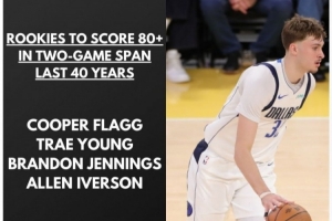 過(guò)去40年,只有四位新秀連續(xù)兩場(chǎng)比賽合砍80+,分別是弗拉格、特雷·楊、詹寧斯和艾弗森。