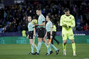 體育資訊2月1日訊 西甲第22輪比賽,萊萬(wàn)特在主場(chǎng)和馬競(jìng)互交白卷。本場(chǎng)比賽,兩名女性裁判出現(xiàn)在裁判團(tuán)隊(duì)中,兩人均是擔(dān)任助理裁判。