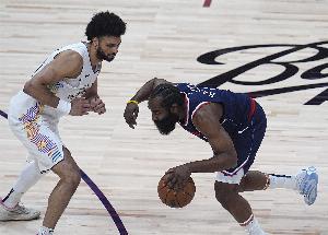 上賽季季后賽首輪快船和掘金搶七的比賽,哈登8投2中,得到7分5板13助攻2失誤,正負(fù)值-29。