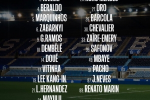 前鋒:9-貢薩洛·拉莫斯、10-登貝萊、14-杜埃、29-巴爾科拉、49-姆巴耶