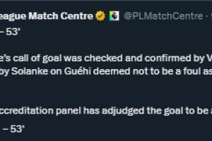 裁判的進(jìn)球判罰經(jīng)過VAR檢查和確認(rèn),索蘭克對格伊的接觸不構(gòu)成犯規(guī),因?yàn)榍罢吲龅搅饲?。進(jìn)球認(rèn)證小組已經(jīng)判定為該進(jìn)球是索蘭克的進(jìn)球。