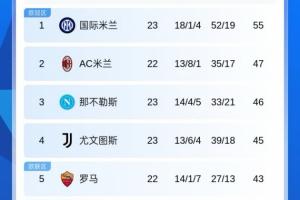 目前國米55分第一,米蘭未賽47分第二,那不勒斯46分第三,尤文45分第四,羅馬未賽43分第五,科莫41分第6。