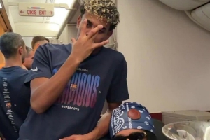 巴薩官方更新社媒動態(tài),曬出亞馬爾等球員在飛機內(nèi)與獎杯合影的視頻和照片,慶祝球隊奪冠。