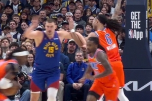 GIF-約基奇和杰林·威廉姆斯在場上對抗拉滿 甚至開始轉(zhuǎn)圈圈