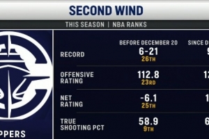 快船主場(chǎng)迎戰(zhàn)黃蜂,轉(zhuǎn)播方對(duì)比了快船前27場(chǎng)和近11場(chǎng)各項(xiàng)數(shù)據(jù)對(duì)比。