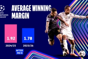 聯(lián)賽階段還帶來了更小的勝利差距,平均勝利差距為1.78個進球,低于上賽季的1.92個進球。比賽更加接近、更具競爭力和戲劇性。