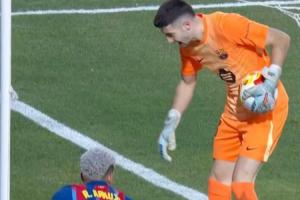 比賽過程中,曾出現(xiàn)令人啼笑皆非的一幕。上半場,阿勞霍和霍安·加西亞合力防下了對手的一次進(jìn)攻,阿勞霍憑借與對方球員身體對抗搶占下優(yōu)勢身位,霍安則是出擊將球沒收。