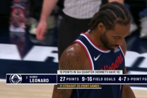 (注:倫納德個人最長紀(jì)錄為連續(xù)22場得分20+)