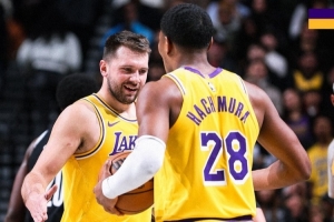 賽后,湖人官方少初本場贏球海報,東契奇和八村塁登上封面。