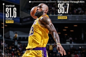 老詹今日對陣籃網(wǎng)暴扣垂直起跳80.3厘米&滑行2.9米 球過筐時速57.5公里(16.7米每秒)