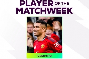 此役卡塞米羅貢獻(xiàn)傳射,幫助曼聯(lián)取勝,英超官方宣布,卡塞米羅當(dāng)選第24輪最佳球員。