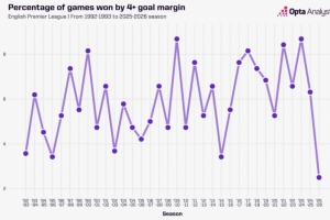 本賽季英超至今,只有2.5%的比賽以至少4個(gè)凈勝球的優(yōu)勢獲勝,這是該項(xiàng)賽事歷史上的最低比例。阿森納周六4-0大勝利茲聯(lián),這是本賽季第6場至少凈勝4球的情況,而在2023-24賽季,這樣的勝利出現(xiàn)了33次。