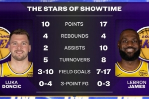 賽后,轉(zhuǎn)播方曬出詹姆斯和東契奇本場的數(shù)據(jù),東契奇?zhèn)酥淮蛄?6分鐘10投3中,三分4中0僅得10分,出現(xiàn)5次失誤;詹姆斯得到17分10助攻,但投籃17中7,三分3中0,還出現(xiàn)8次失誤。