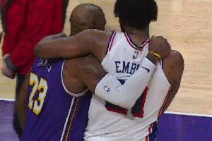 里夫斯沖過(guò)來(lái)和八村塁相擁~!??!詹姆斯和恩比德也抱在一起~?。。?/p>