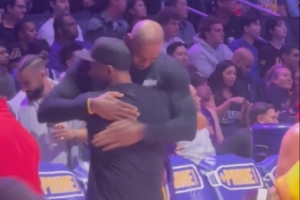 本場比賽,黑人影帝丹澤爾·華盛頓來到現(xiàn)場看球,他還來到詹姆斯身邊,兩人擁抱并寒暄數(shù)句。