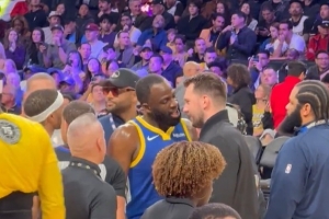 GIF-追夢場邊狂噴東契奇 之后兩人全笑了