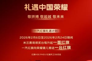 一汽紅旗在宣傳海報(bào)中寫(xiě)道:米蘭賽場(chǎng)領(lǐng)獎(jiǎng)臺(tái)每升起一面紅旗,一汽紅旗向榮耀健兒贈(zèng)送一臺(tái)紅旗。