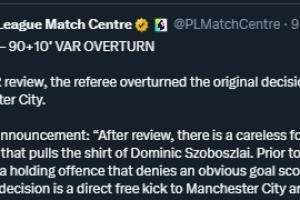 體育資訊02月09日訊 英超官方解釋曼城vs利物浦最后時(shí)刻,索博斯洛伊直紅以及曼城的進(jìn)球被改判為任意球。