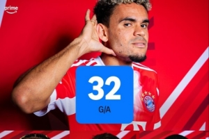 根據(jù)統(tǒng)計,迪亞斯本賽季至今代表拜仁出場30次,打進(jìn)18球助攻14次,直接參與進(jìn)球32個。
