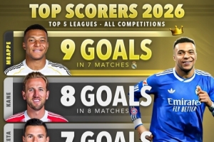 體育資訊2月10日訊 Score90統(tǒng)計(jì)了五大聯(lián)賽球員2026年各賽事的進(jìn)球數(shù)量,并列出2026年進(jìn)球榜,姆巴佩7場(chǎng)9球居首。