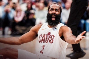 賽后,騎士官推發(fā)布贏球海報,封面直接是哈登坐在地上對裁判攤手的瞬間。